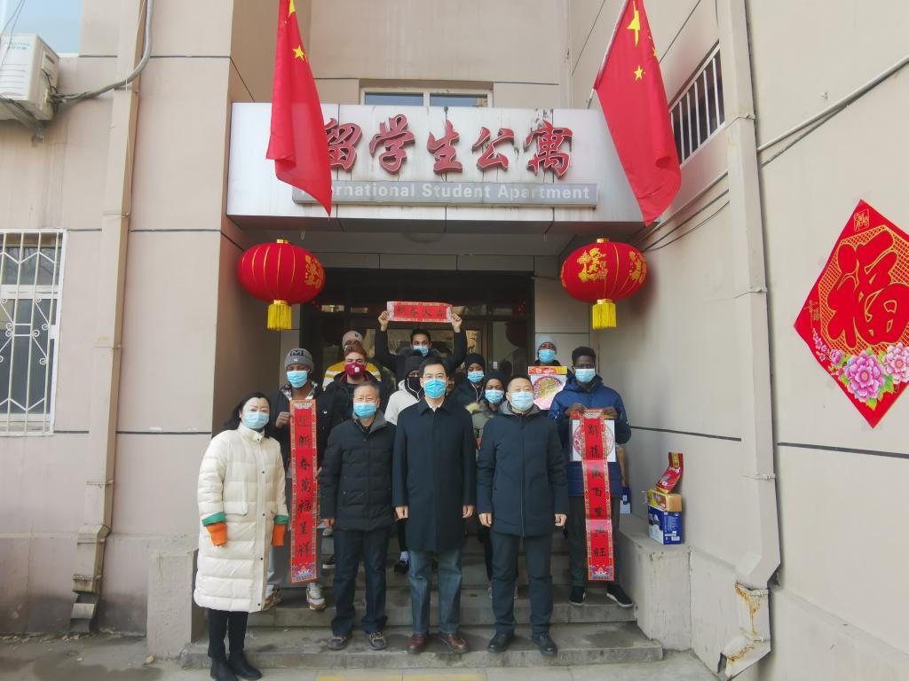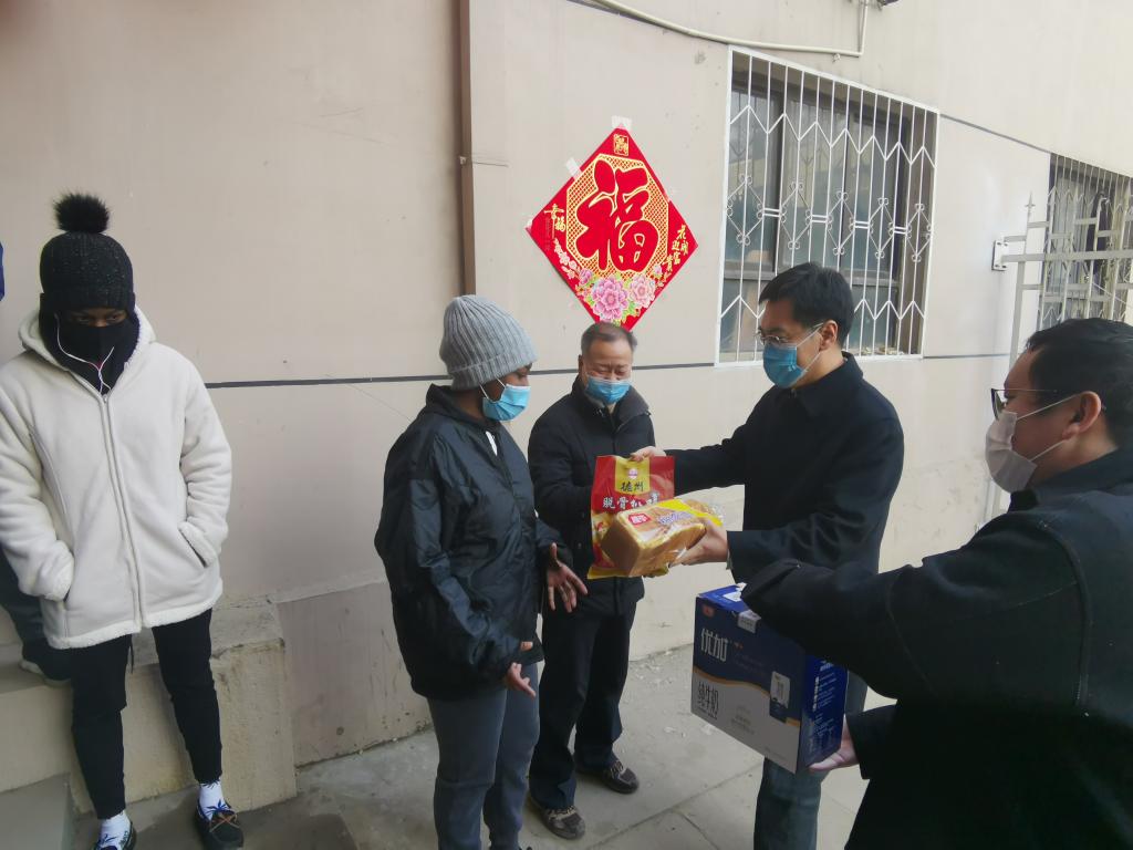在留学生公寓楼前,赵永强一行看望慰问了bat365官网留学生,为留学生送去了新春礼包,并代表学校感谢同学们对中国抗疫工作的大力支持与积极配合,希望同学们在新的一年里学业有成,继续当好中外友谊的使者,为家乡建设贡献力量。同时,赵永强还慰问了留守在留学生公寓的宿管工作人员,并代表学校感谢他们“舍小家、为大家”的无私奉献,祝愿大家新春佳节幸福安康。