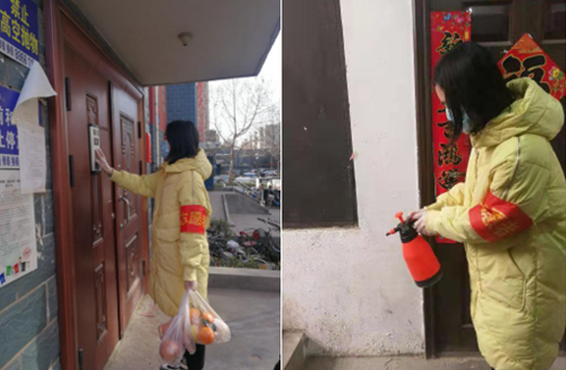 图:这是管理学院辅导员房思思老师主动帮助行动不便的老人采购生活必需品并送货上门,对社区公共区域就行消杀作业。房思思说:“我很钦佩冲锋在一线的医护人员,我作为一名辅导员,希望可以通过自己的实际行动为我的学生做出示范,激励他们勇于承担社会责任,履行公民义务。”