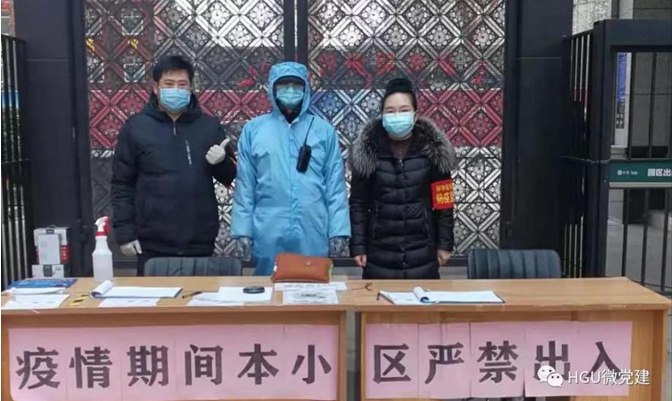 图:这是地球科学学院王智慧老师和社区其他志愿者共同组成了志愿者服务团队,配合居委会和物业一起为小区居民防护站岗、记录登记、物品消杀,为杜绝病毒传播和守护居民健康履行了共产党员的带头作用。