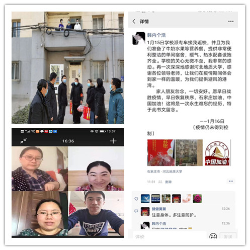 图:这是土地科学与空间规划学院党委书记白翠玲携领导班子成员到学生宿舍慰问滞留学生,韩同学发朋友圈告知家人朋友自己已被学校派车接回,一切安好。辅导员通过视频会议及时部署学生帮扶工作,为身处困境学生送去“定心丸”。