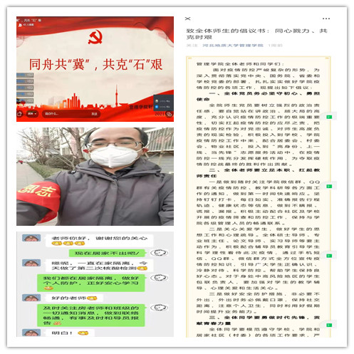图:这是管理学院党委发出“同心戮力、共克时艰”倡议书,辅导员主动与学生联络,关怀返乡学生身体健康状况,财会系学生党支部党员、学生干部组织防疫知识集体学习视频会议,民主党派教师也参与到社区志愿服务工作,这充分彰显党的组织力在疫情防控中的优势作用。