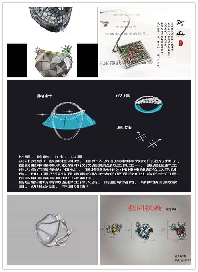 图:宝石与材料学院发动学生利用专业技能创作抗疫主题作品,凝聚抗疫必胜决心和力量。这是产品设计专业学生设计的首饰设计作品。