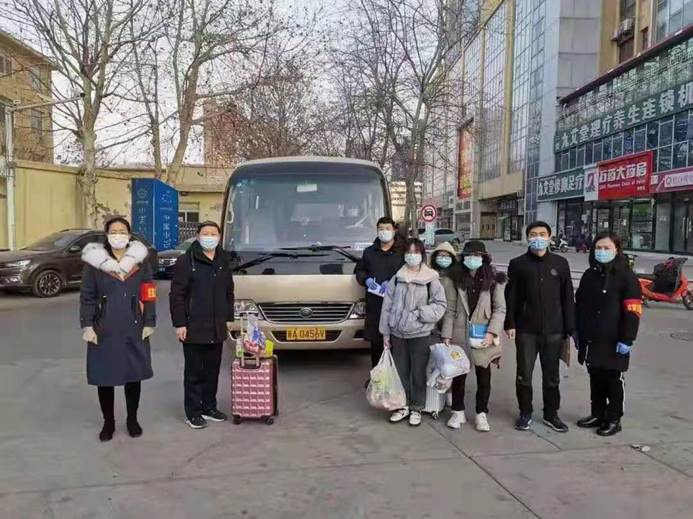 图:这是1月15日上午,学校派出专车将滞留在石家庄市各宾馆的第一批16名同学安全接回学校,为他们发放口罩等防疫物资,做好疫情防控各项工作,并为他们妥善安排好食宿。