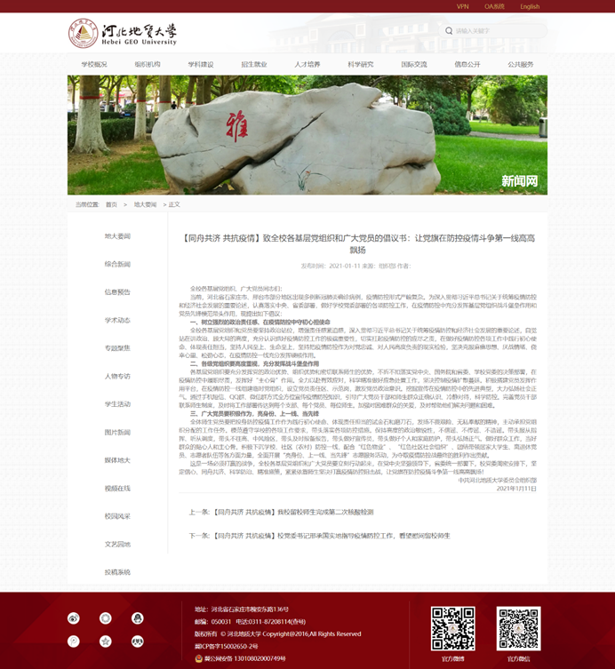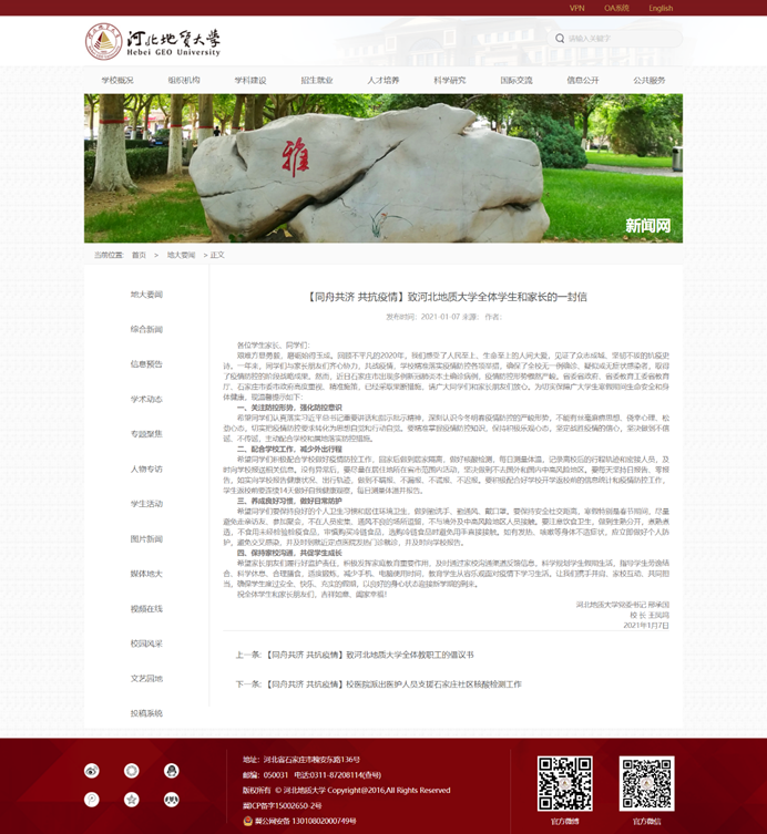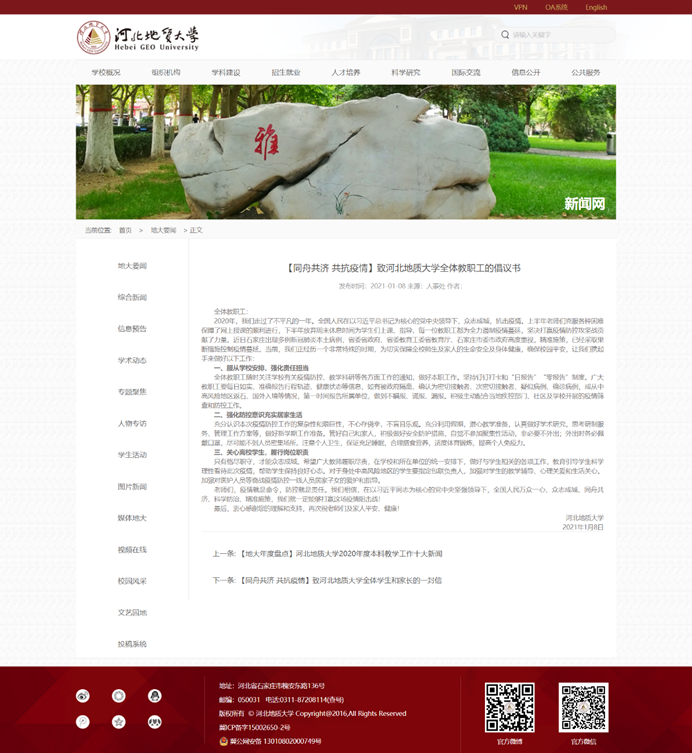 图:1月8日,学校通过新闻网发布致bat365正版唯一官网全体教职工的倡议书,号召全体教职工服从学校安排,强化责任担当;强化防控意识,充实居家生活;关心离校学生,履行岗位职责,携手共渡难关,共克时艰。