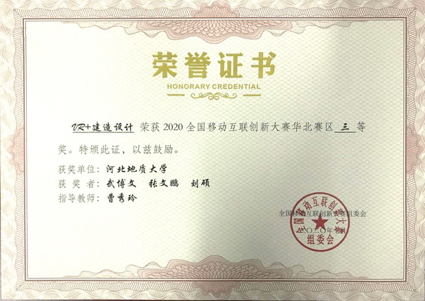 近日,全国移动互联创新大赛高校组(华北赛区)总决赛结果公布,bat365官网城市地质与工程学院武博文、张文鹏、刘硕同学组成的“VR+建造设计”团队在教师曹秀玲指导下荣获华北赛区三等奖。