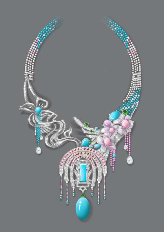 鲍子仪同学的一等奖作品设计主题突出,项链两边的樱花造型作为底部樱花树树冠的延伸,搭配花下粉珊瑚珠串,使首饰充满动态流动感,更加富有生机。整个作品采用清淡的粉蓝白调用浪漫的表现方式,表达了对疫情结束后荆楚大地的“千”樱新生活的美好向往!表达了对抗疫斗争的讴歌和取得最终胜利的期盼,思想内涵丰富!