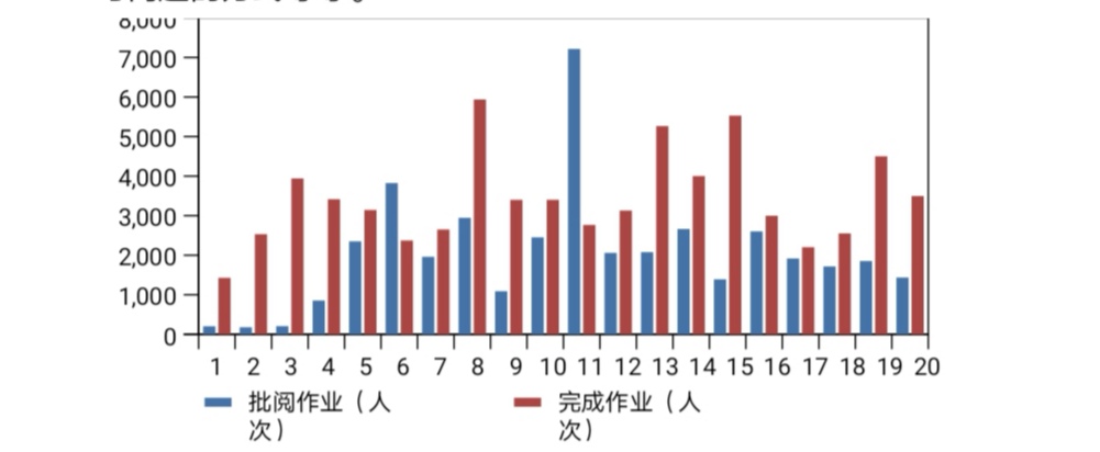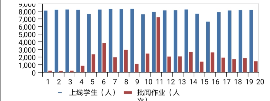 如下图,在超星平台上学习的学生人数平均在8000左右,约占bat365官网本科生总人数的50%。前4个教学周当中,教师批阅作业总量为40994人次,平均每名教师每周批阅量为58.6份,约为两个自然班的学生总数。