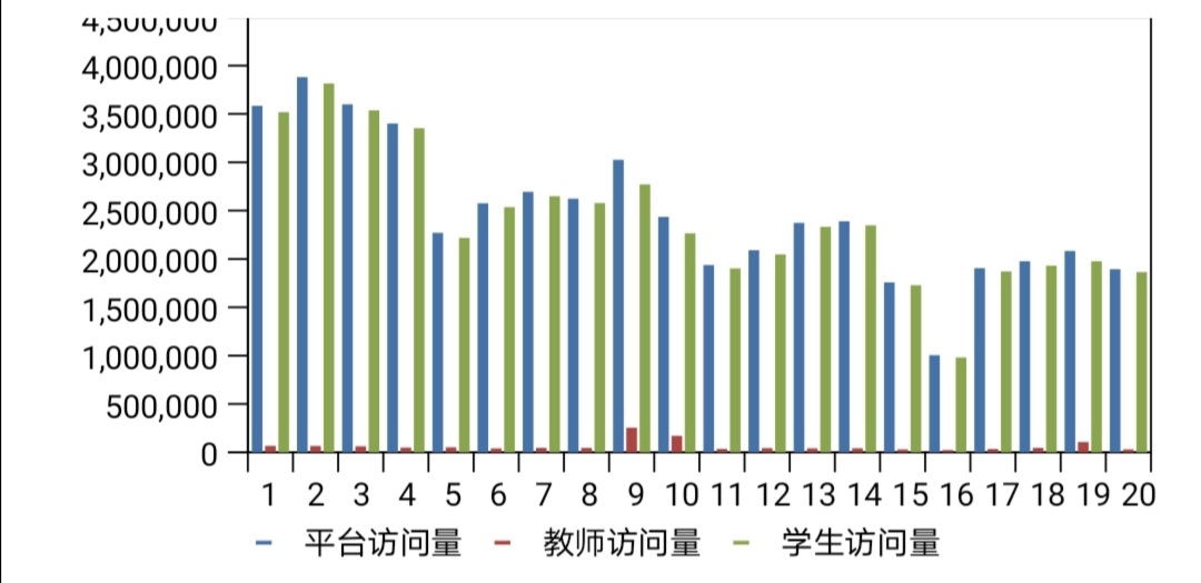 图3是各天次中平台访问量和师生访问量的情况示意图,学生访问量总体上呈现逐周下降并最终趋于平稳的状态,广大学生是平台访问量的主体。