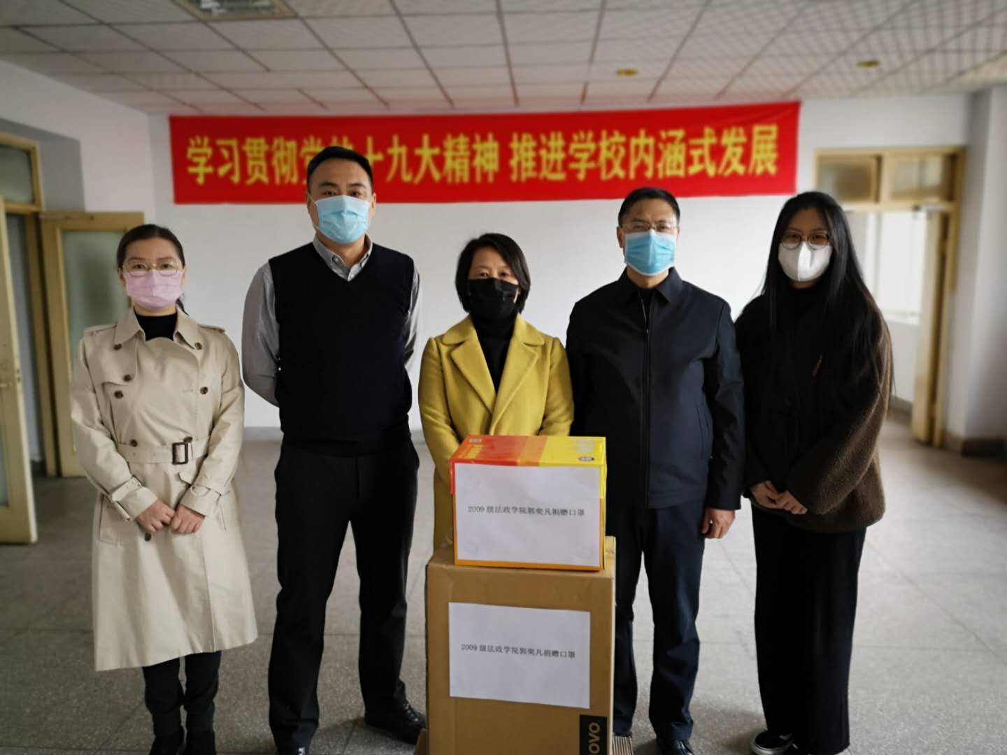 3月12日上午,法政学院院长侯丽艳,党委副书记兼副院长王立校,党委副书记马沁芳,校友办王磊老师接受了组织部副部长赵强转交的口罩,侯丽艳代表法政学院对郭奕帆校友的爱心捐赠表示衷心感谢。她表示,郭奕帆身在异乡还惦记着母校,非常难得,这批口罩大大缓解了学校的防疫压力,为开学后老师和学生们的工作和学习提供了一定的保障。