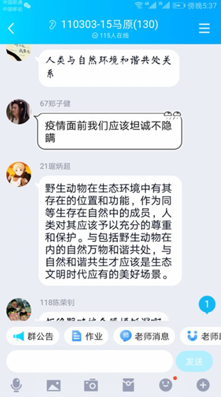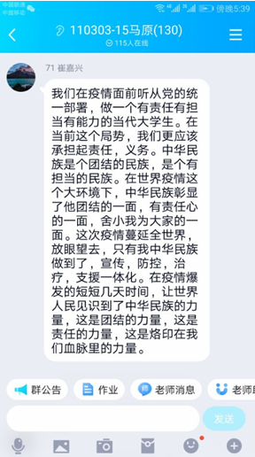 马克思主义基本理原理教研室教师们分别通过“钉钉”、“QQ”等网络方式与学生展开了充分的交流。同学们纷纷以文字、图片的形式表达自己的感受和体会。