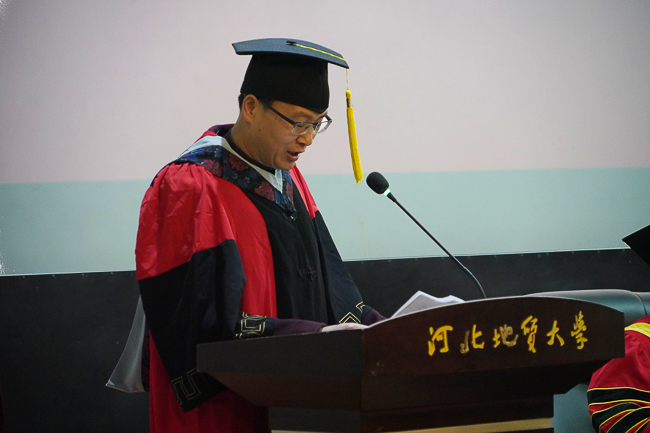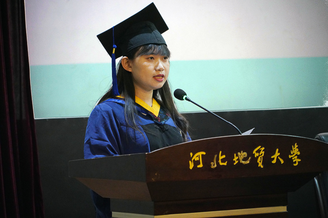 毕业研究生代表、地质工程专业韩娜同学发言,回忆了在校学习生活的点点滴滴,表示将谨记师恩,秉承“达观博物”的校训,在新的岗位认真工作,不辜负母校的殷切期望!
