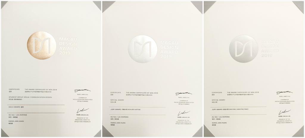 12月12日,2019年澳门设计大奖颁奖典礼在珠海隆重举行。bat365官网艺术设计学院2017级视觉传达专业徐慧、刘志鹏同学凭借作品《相见欢》在众多作品中脱颖而出,最终荣获学生组视觉传达设计类金奖一项,评审奖两项(此次大赛评审奖共三项)。