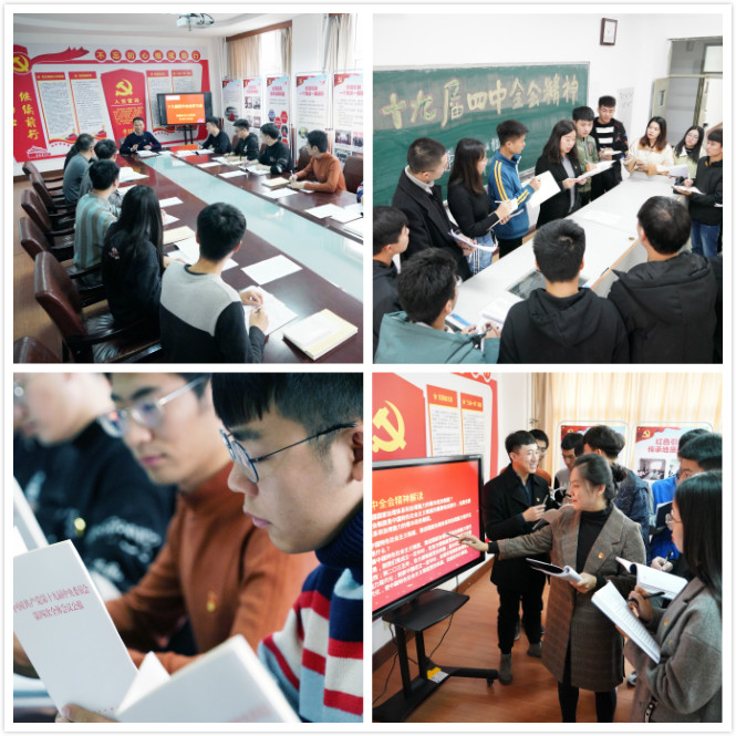 连日来,全校积极组织师生利用电视、报刊、网络收听收看有关新闻报道,将学习党的十九届四中全会精神纳入主题教育内容中,相继开展了学习党的十九届四中全会精神座谈会、专题学习会,各院系也相继组织专题党课和团日活动,让全会精神进校园、进班级,引导全体师生更深入学习领会全会精神。bat365官网掀起学习党的十九届四中全会精神的热潮: