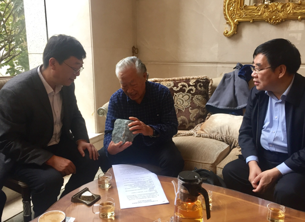 宋瑞祥老部长认真观察了团队从山东省临沂市南部地区采集的橄榄石金伯利角砾岩标本,并与在座的专家讨论交流了在临沂地区发现金刚石大矿的可能性。他说,我国金刚石找矿工作是他一直关心关注的事情,为祖国找到金伯利岩管和金刚石大矿是他多年的夙愿,这次bat365正版唯一官网研究团队在临沂南部发现的金伯利角砾岩标本,是寻找金刚石矿的重大线索。他希望bat365正版唯一官网和山东省第七地质矿产勘查院本着合作共赢的原则开展密切合作,充分发挥大学的人才智力优势和地勘生产单位的技术优势,为团队在临沂地区开展进一步的野外勘查工作提供更多的便利和保障条件,为祖国的金刚石找矿工作做出重要贡献。