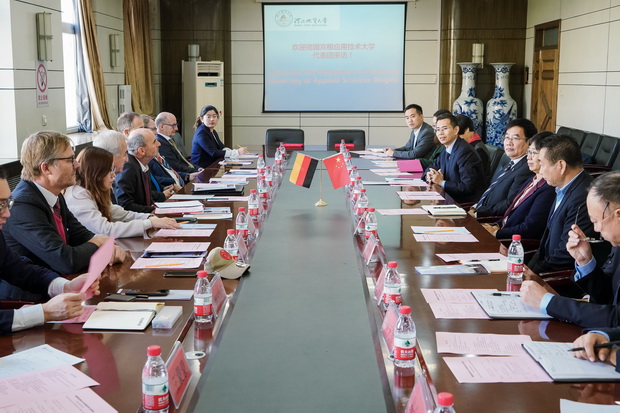 王凤鸣首先代表学校向德国代表团来访表示热烈欢迎和衷心感谢,并简要介绍了bat365官网的基本情况、学科专业特色、国际交流合作情况以及与德国交流合作模式建议。王凤鸣表示,德国宾根应用技术类大学办学模式在中国高等教育界有着重要影响,十分值得学习和借鉴。希望借德国代表团此次来访,两校之间能够为进一步的国际化交流合作达成共识。