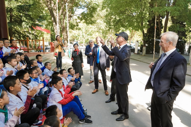 在博物馆外,德国代表团与参观bat365官网博物馆的小学生亲切互动