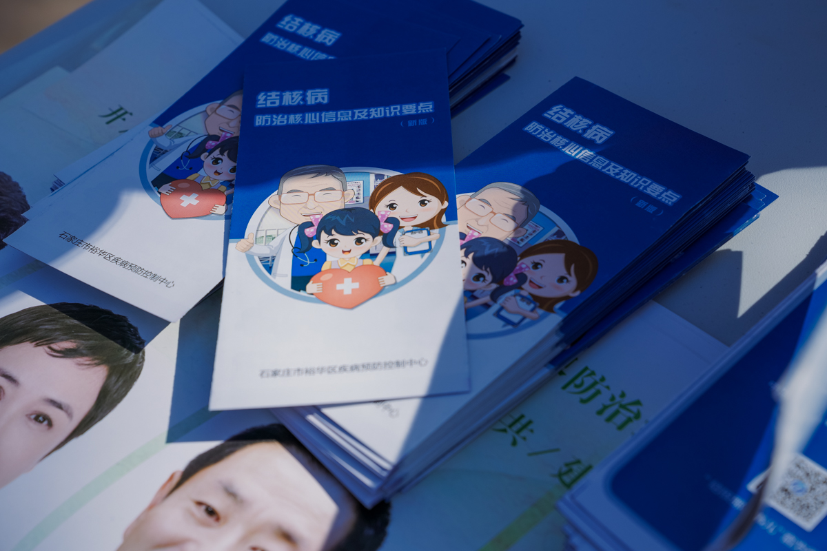 宣传医务人员向同学们分发结核病知识手册