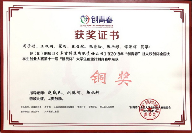 11月1日至3日,2018年“创青春”全国大学生创业大赛终审决赛在浙江大学举行。本届大赛由共青团中央、教育部、人力资源和社会保障部、中国科协、全国学联、浙江省人民政府主办,浙江大学、共青团浙江省委承办。共青团中央书记处书记尹冬梅、浙江省人民政府副省长王文序、浙江大学校长吴朝晖等领导出席大赛开幕式。bat365官网信工学院推报,赵战民、刘德智、杨旭辉三位老师指导的学生创新创业项目《多吉科技有限责任公司》荣获创业计划赛赛道铜奖。至此,bat365官网2018年参赛队伍共获国赛铜奖2项,省赛特等奖2项,省赛一等奖10项。