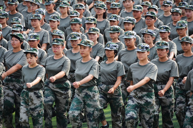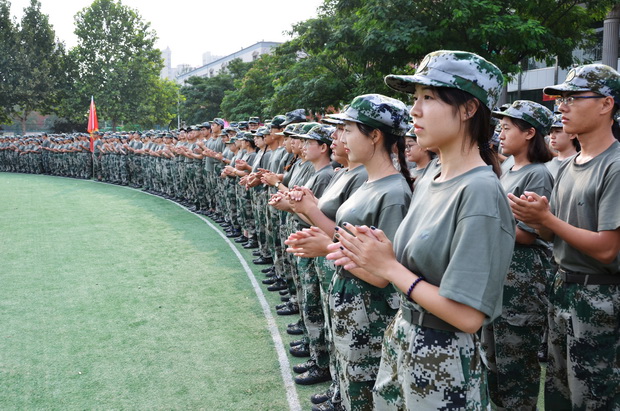 汇报表演在雄壮的国歌声中拉开帷幕。全体2018级本科新生身着迷彩服,目光坚毅、气宇轩昂,在教官的带领下,列着整齐的队伍、喊着嘹亮的口号接受校领导、老师和教官的检阅。