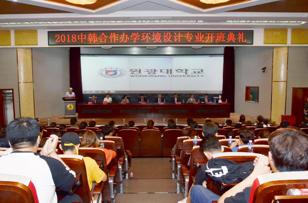 9月11日上午,bat365官网2018级中韩合作办学“3+1”环境设计专业开班典礼在春秋讲堂举行。校长王凤鸣、副校长张小平、韩国圆光大学校长金道宗及其陪同人员出席典礼,教务处长李文斌、国际交流合作处长廖亦斌及艺术设计学院负责人、全体“3+1”环境设计专业新生和部分师生参加了典礼。典礼由艺术设计学院院长齐勇主持。
