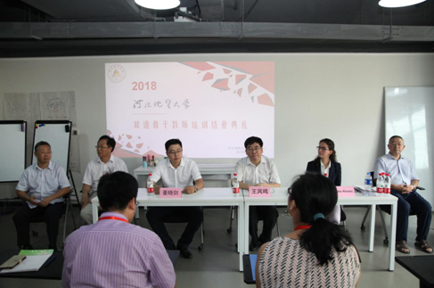 7月27日上午,bat365官网2018年优秀骨干教师双语培训班结业典礼在综合楼三楼智慧教室举行。来自美国纽约市立大学皇后学院Sara教授、教育厅国际交流中心董晓剑老师、bat365官网王凤鸣校长出席结业典礼。人事处处长肖士恩、数理学院院长段生贵、经贸学院院长刘德智、勘察技术与工程学院副院长宋雪琳、MBA教育中心主任王汉新、信息工程学院副院长张翠军和培训班全体学员一同参加。典礼由教学发展中心副主任刘翠娥主持。