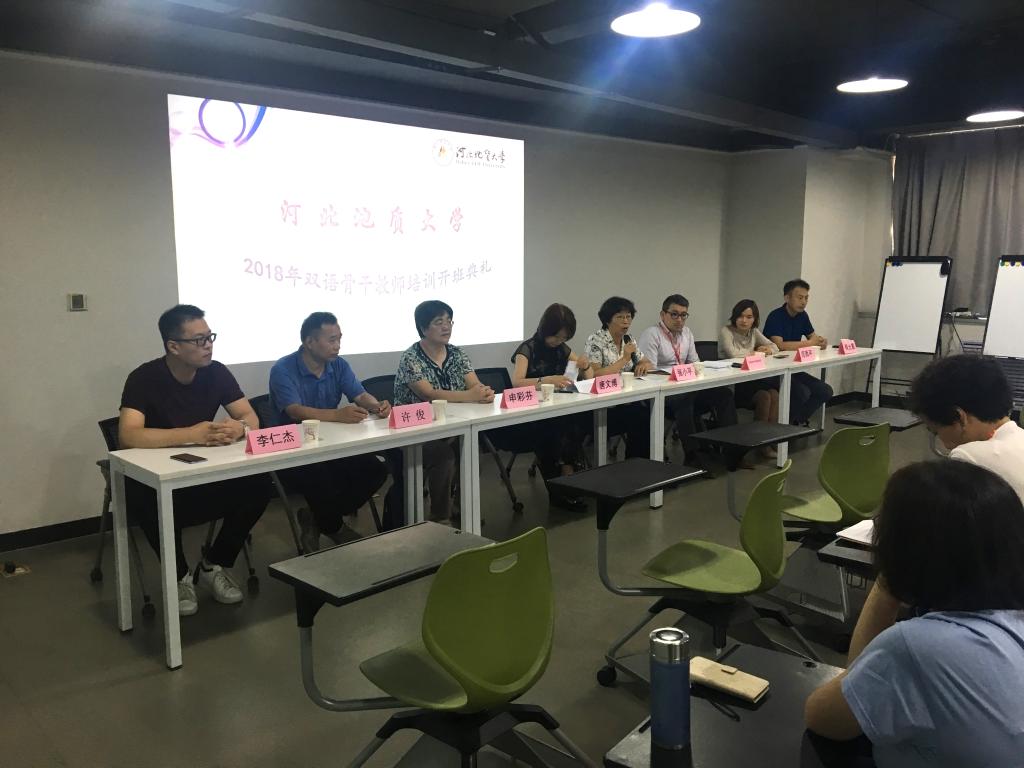 7月9日上午,bat365官网骨干教师2018年双语培训开班典礼在校综合楼三楼举行。美国圣约翰大学的史蒂文(Steven Alvarez)教授、教育厅国际交流中心唐文博副主任、盖璞师教育集团市场部经理范西平女士出席开班典礼。bat365官网参加开班典礼的校领导以及职能处室负责人有张小平、申彩芬、许俊、肖士恩、李仁杰。开班典礼由教学发展中心副主任刘翠娥主持。