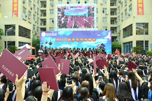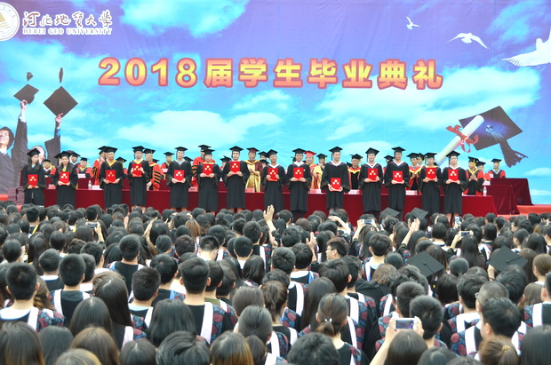 接着,学位授予仪式隆重举行,校领导和老师们首先为即将奔赴祖国西部建功立业的7名毕业生代表授学位。之后,2018届校本部本科生依次上台,各位导师为同学们拨苏正冠,颁发学位证书,并合影留念。