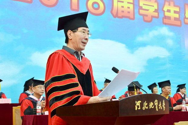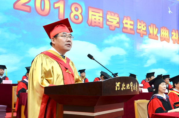 校长王凤鸣发表致辞,向圆满完成学业的同学们表示热烈祝贺,向辛勤培育同学们的老师和家长们表示衷心的感谢。他说,在校学习四年的时光,你们改变了学校,学校也改变了你们。你们的收获不胜枚举,你们用实际行动诠释了自己的成长,母校为你们取得的成绩感到骄傲和自豪!王凤鸣通过现场评论李春来校友成功登顶珠峰的逐梦历程,通过分享六次赴南极的中国科考队队长李院生、担任“张衡一号”卫星工程首席科学家申旭辉、担任大陆深部钻探工程总指挥张金昌、油气勘探和工程管理专家谢玉洪、大国工匠勘探专家徐长贵、登上学术巅峰的两院院士武强、侯增谦、毛景文等优秀校友的逐梦故事,鼓励同学们既要做追梦者,也要做圆梦人。