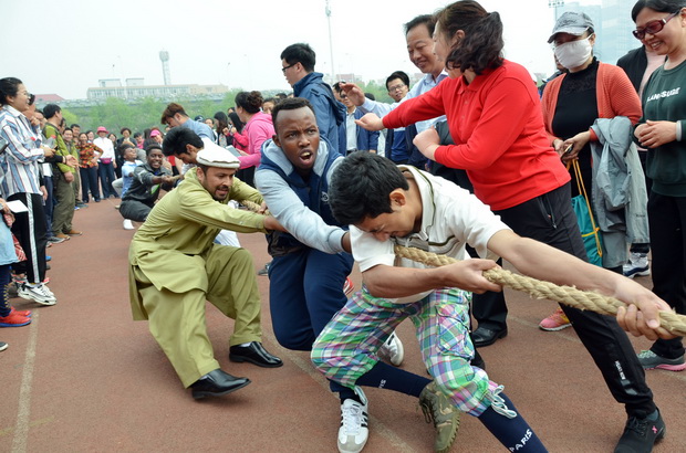 留学生代表队参加拔河比赛