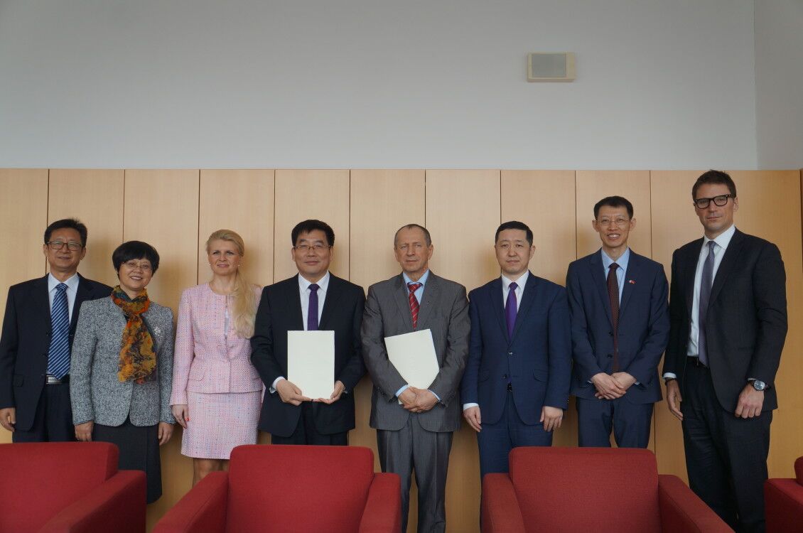 《孔子课堂执行协议》和《孔子课堂章程》签署后,中外理事会成员王校长(左4)和捷克奥斯特拉发大学校长瓦克拉夫.斯纳舍尔(右4)等与中国驻捷克大使馆政务参赞陈建军(右3),教育组长赵长涛(右2)合影留念