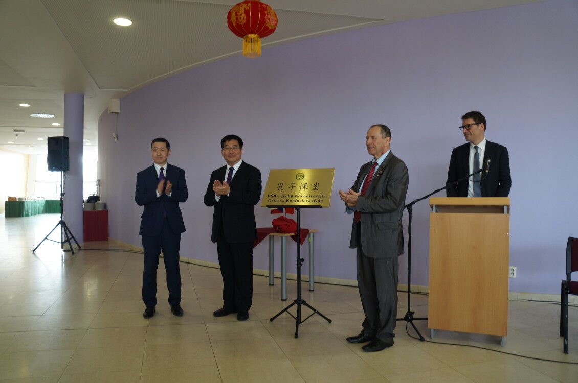 双方校长为孔子课堂揭牌,中国驻捷克大使政务参赞陈建军(左1)出席揭牌仪式并致辞祝贺