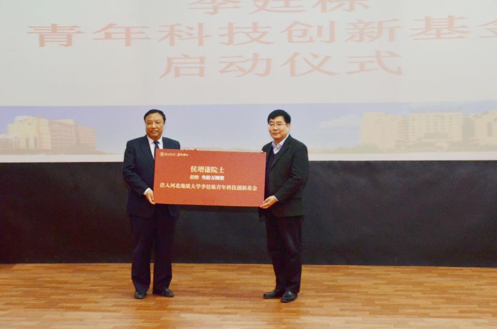 王凤鸣校长发表致辞,深情回顾了88岁高龄的廷栋校长在省部共建、学校更名等重大事件中对学校的关心和帮助,侯增谦校友、中国地科院、地质所对学校的发展建设的大力帮助和鼎力支持。他表示,两位院士的高风亮节、捐资助教令我们非常感动。我们会管理用好每一笔奖励,使基金真正成为鼓励青年、鼓励创新的资助金、激励金。希望青年学子珍惜学校提供的机会,在学习过程中创新有为,提高科研水平。