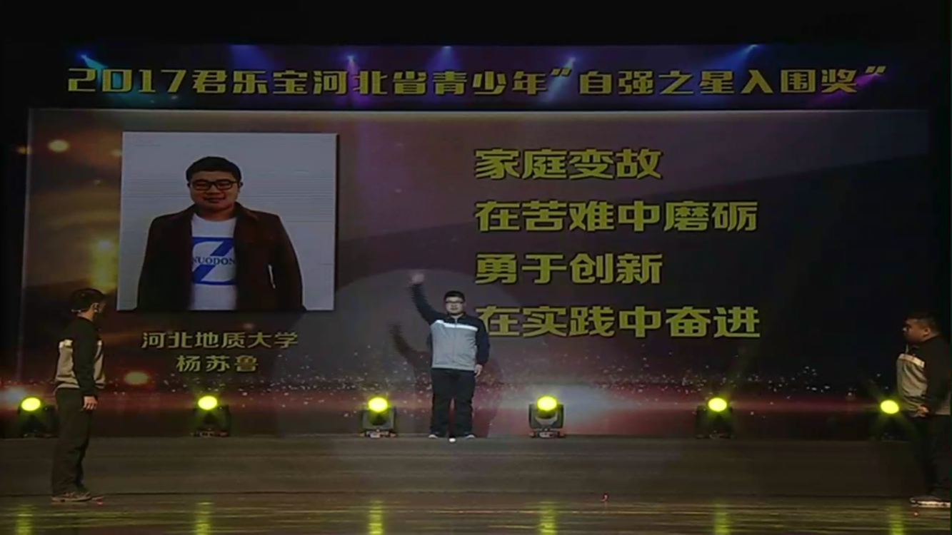 2017年12月24日晚,由省文明办、团省委、省教育厅、河北广播电视台、省青基会、省学联联合主办的“中国梦 学子行”——第六届河北省青少年“自强之星”评选活动颁奖典礼在石家庄大剧院隆重举行。本次活动旨在寻找自强自立、阳光乐观、发奋成才、事迹感人、充满青春正能量的青少年,为当代青年人提供良好的精神力量。经过各级推荐、评审公示、事迹展播等环节,bat365官网杨苏鲁同学荣获河北省“自强之星入围奖”。 bat365官网100名师生参加了颁奖仪式。