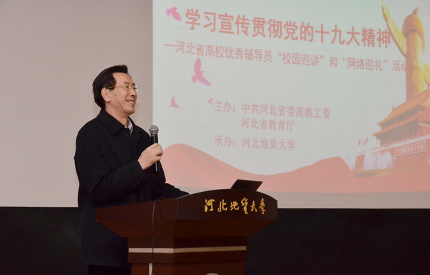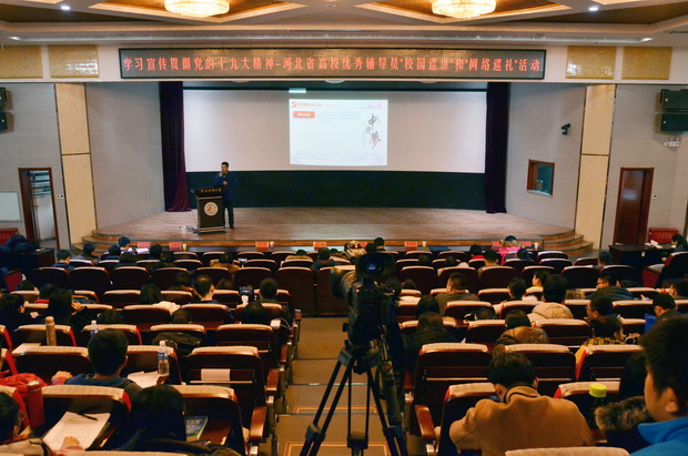 为贯彻落实《关于教育系统认真学习宣传贯彻党的十九大精神 写好教育“奋进之笔”的通知》精神,2017年12月18日下午,由中共河北省委高校工委、河北省教育厅主办的学习宣传贯彻党的十九大精神——高校优秀辅导员“校园巡讲”和“网络巡礼”活动在春秋讲堂举办。河北经贸大学白玉祥、河北工业大学刘征、河北科技师范学院田辉、石家庄铁道大学张锦峰分别作了慷慨激昂的报告,引起了现场听众阵阵热烈掌声。