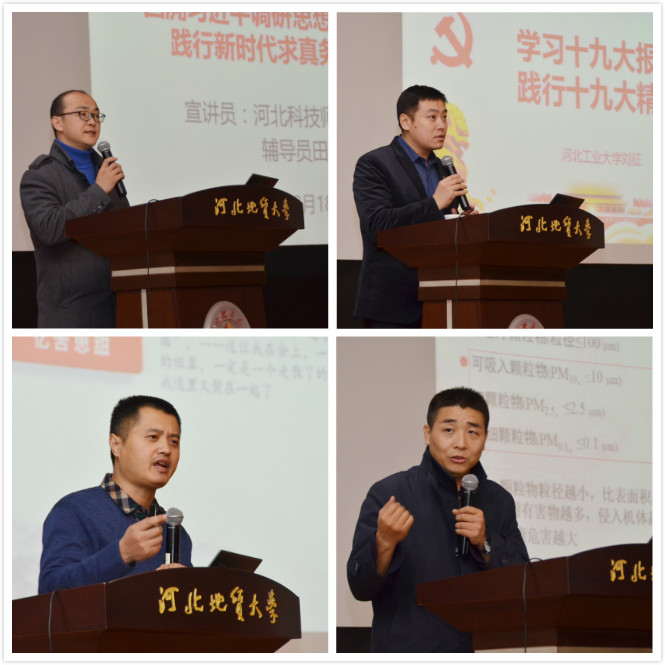 河北经贸大学公共管理学院党委副书记白玉祥《坚定绿色发展,践行美丽中国——做不愧时代的伟大践行者》的报告围绕党的十九大报告中关于生态文明建设的亮点、内涵以及我国生态文明建设的成效与问题进行了讲解;河北工业大学本科生院学生教育管理中心主任刘征《学习十九大报告,践行十九大精神》的报告围绕党的十九大的主题和意义、报告部分内容解读、不忘初心永远跟党走做了生动阐述;河北科技师范学院副处级辅导员田辉《回溯习近平调研思想形成路径,践行新时代求真务实创新精神》的报告从萌芽期、形成期、完善期、成熟与发展期四个方面论述了习近平调研思想的发展形成;石家庄铁道大学辅导员张锦峰老师《理想信念与使命担当》的报告从树立理想指引方向、注重学习提升本领、牢记使命重在担当三个方面分享了对“不忘初心,永远跟党走”的理解和体会。