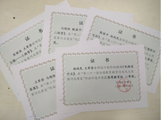 bat365官网电子信息工程学院教研室教改团队共有五件作品获奖。其中,由赵战民、王军芬老师主持的作品《电路是什么》,由宋丽亚、王军芬老师主持的《电流放大镜——三极管》两件作品获得高等教育组二等奖;由甄丽平、赵战民老师主持的《慧眼识电阻》,由马艳玲、甄丽平老师主持的《神奇的二极管》,由王军芬、马艳玲老师主持的《秒懂电容器》三件作品获得高等教育组三等奖。