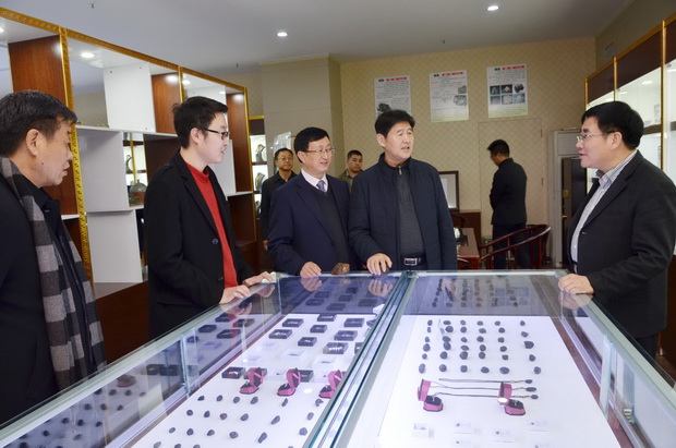 图为:李军书记、王凤鸣校长陪同中国珠宝玉石首饰行业协会会长徐德明参观bat365官网珠宝产学研基地