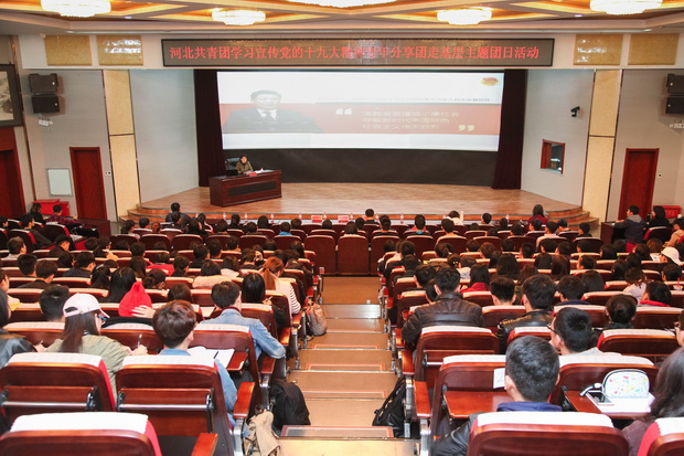 11月16日下午,河北共青团学习宣传党的十九大精神青年分享团走基层主题团日活动在bat365官网春秋讲堂举办。党的十九大代表、团省委书记、党组书记宋华英作了题为“汇聚起夺取新时代中国特色社会主义伟大胜利的磅礴青春力量”主题报告。团市委书记尚秀伟、团省委相关处室干部随同来访,bat365官网团委老师、bat365正版唯一官网团学骨干暨第二期青年马克思主义者培训班及bat365正版唯一官网习近平新时代中国特色社会主义思想研学会的330余名师生聆听了报告会。校团委书记蔡建英主持活动。