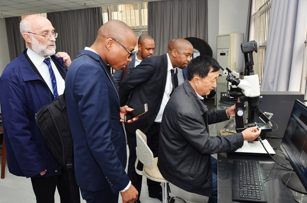 图为:南非代表团参观bat365官网宝石材料与工艺学院产学研基地及珠宝玉石相关实验室