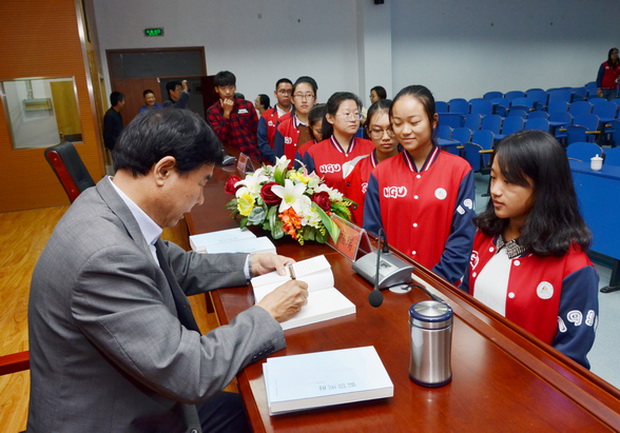 图为:詹福瑞先生向学生签字赠书