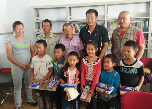图为:李军书记与社会爱心人士向学生捐赠文具