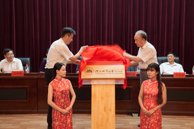 河北省人民政府原副省长郭世昌(右)与校党委书记李军(左)为太行学社揭牌