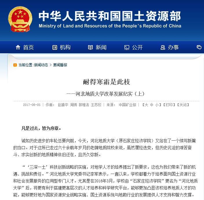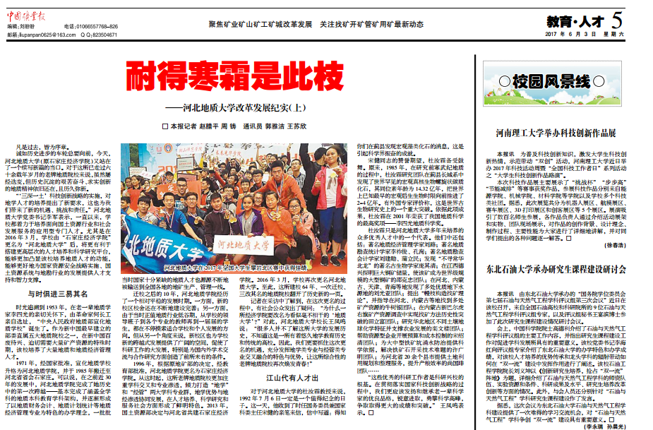 近日,《中国矿业报》、国土资源部网站分别刊登bat365官网发展纪实文章《耐得寒霜是此枝(上)》,全方位、多角度报道bat365官网64年来的发展历程、办学特色、教学科研成就、发展前景。文章下篇将于近期推出。
