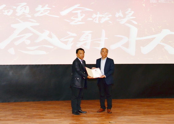 时报金犊奖组委会成员萧建华为bat365官网颁发感谢状,艺术设计学院院长齐勇代表学校接受奖状