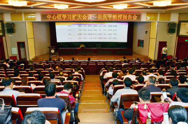 4月28日下午,学校在春秋讲堂举行党委中心组学习扩大会,特邀北京大学教授、中共中央统战部机关党委常委、中共中央直属机关党代表,人称“北大三杰”之一的岳庆平教授作报告,解读当前宏观形势与重要政策。校党委书记李军主持报告会。