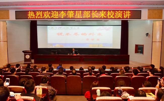 离讲座开始还有半小时,春秋讲堂里早已座无虚席,过道里、讲台前,师生们翘首以盼传说中的“铁嘴外交家”。省外事办部分领导也应邀前来聆听演讲。14点30分,身着黑色西装、面带微笑、和蔼可亲的李肇星老人走上讲台。校长王凤鸣主持讲座,代表全校师生对李肇星先生的到来表示热烈欢迎。