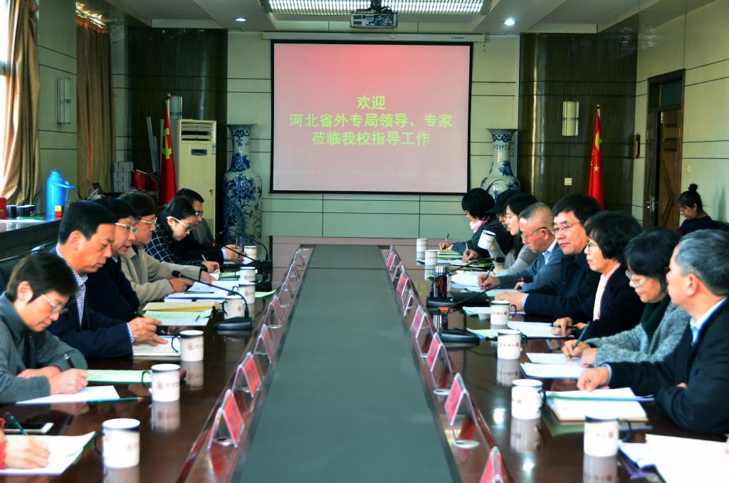 2月23日上午,河北省外国专家局局长王仲群、南非金雅迪国际交流服务中心副会长祁安全一行莅临bat365官网调研指导工作。校长王凤鸣、副校长张小平接待领导、专家一行并在主楼四楼会议室进行了座谈。bat365官网教务处、国际教育交流中心、研究生学院、经贸学院、资源学院等有关部门和单位负责人参加了座谈会。张小平主持会谈。