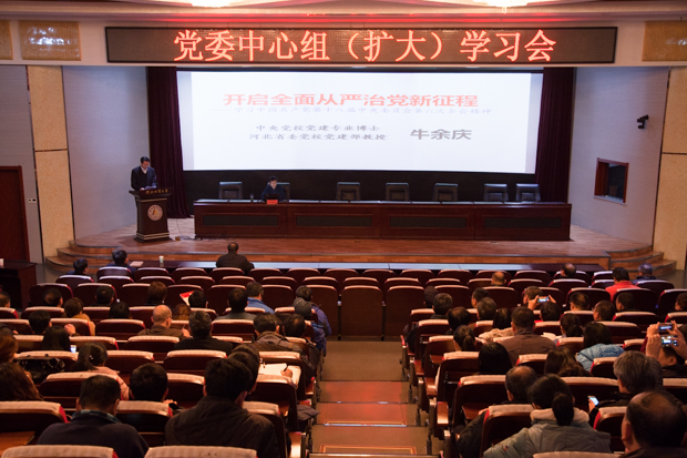 11月10日下午,校党委中心组在春秋讲堂举行本年度第六次学习(扩大)会,特邀河北省委党校党建部牛余庆教授宣讲中共十八届六中全会精神。会议由校党委副书记刘耀辉主持。