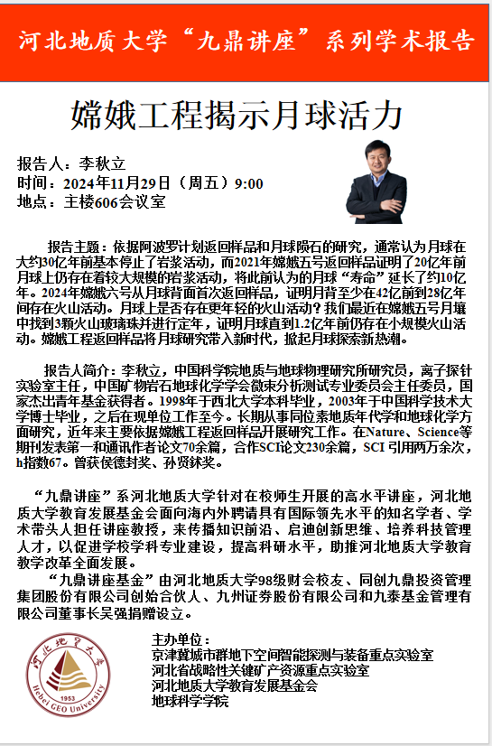 【专家河北行信息预告】“九鼎讲座”系列学术报告—李秋立:嫦娥工程揭示月球活力