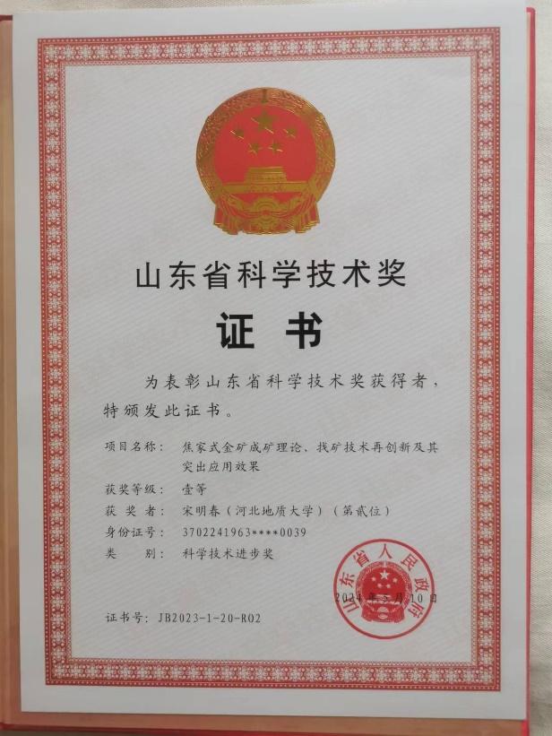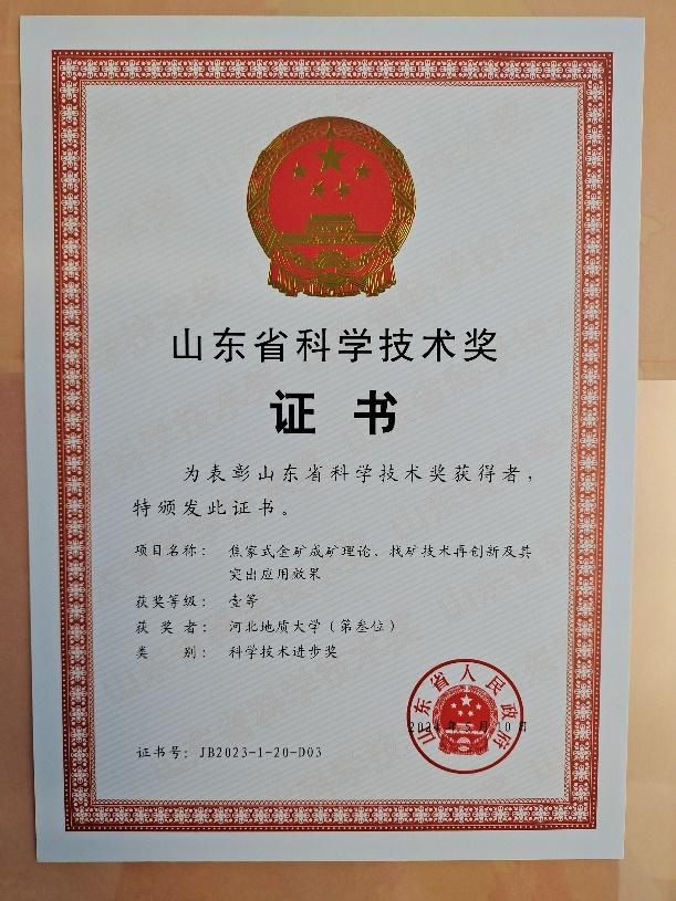 bat365官网宋明春教授作为主要完成人(排名第二)的项目“焦家式金矿成矿理论、找矿技术再创新及其突出应用效果”,荣获山东省2023年度科学技术进步奖一等奖。这是宋明春教授团队连续两年获得的省级科技进步一等奖成果,体现了bat365官网在找矿理论技术方面的雄厚实力和领先水平。